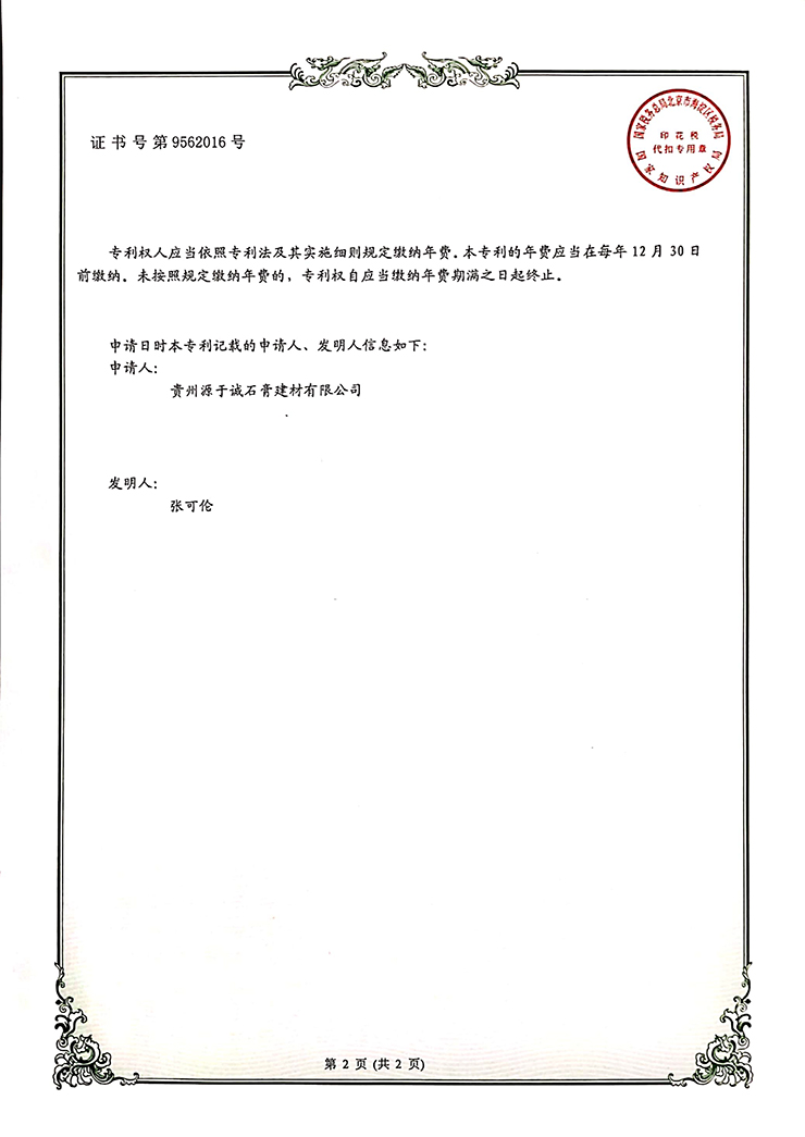 專利證書(shū)(一種石膏板側(cè)壁紙面粘結(jié)裝置)